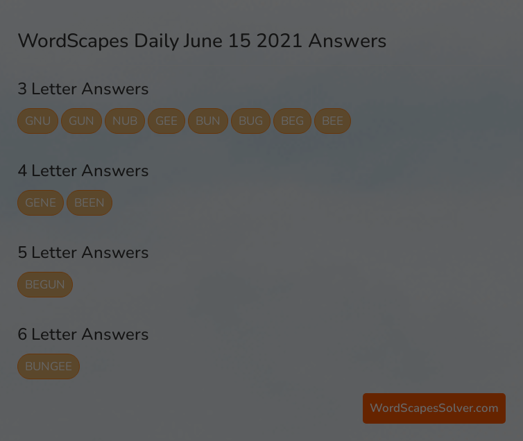 Wordscapes daily answers puzzle june 7 2021 with image and text form is given down below in this today post.wordscapes puzzle answers is a section where we updated all wordscapes game puzzle answers challenge every day. We have created a calendar view for easy navigating through the dates/daily answers. Wordscapes june 11 2021 answers puzzle daily challenge and solution for today: This website will provide you all the daily answers in a professional maner. We offer the full puzzle solution as well as its bonus words to make sure that you gain all the stars of the wordscapes challenge of the day. Wordscapes daily answers puzzle june 15 2021 with image and text form is given down below in this today post.wordscapes puzzle answers is a section where we updated all wordscapes game puzzle answers challenge every day. Wordscapes daily answers puzzle june 17 2021 with image and text form is given down below in this today post.wordscapes puzzle answers is a section where we updated all wordscapes game puzzle answers challenge every day. Sharpen your brain with this fun word puzzle game and beautiful landscapes!challenge your brain with the daily challenges. We update our site every day to make sure you find solutions for all the daily wordscapes puzzles of june 2021. We have all the wordscapes answers for the june 30, 2021 daily puzzle. As the name refers, you will be given a daily challenge each day of the. Only from the google play store it has more than 10,000,000 installs. Wordscapes daily puzzle june 23 2021 answers.